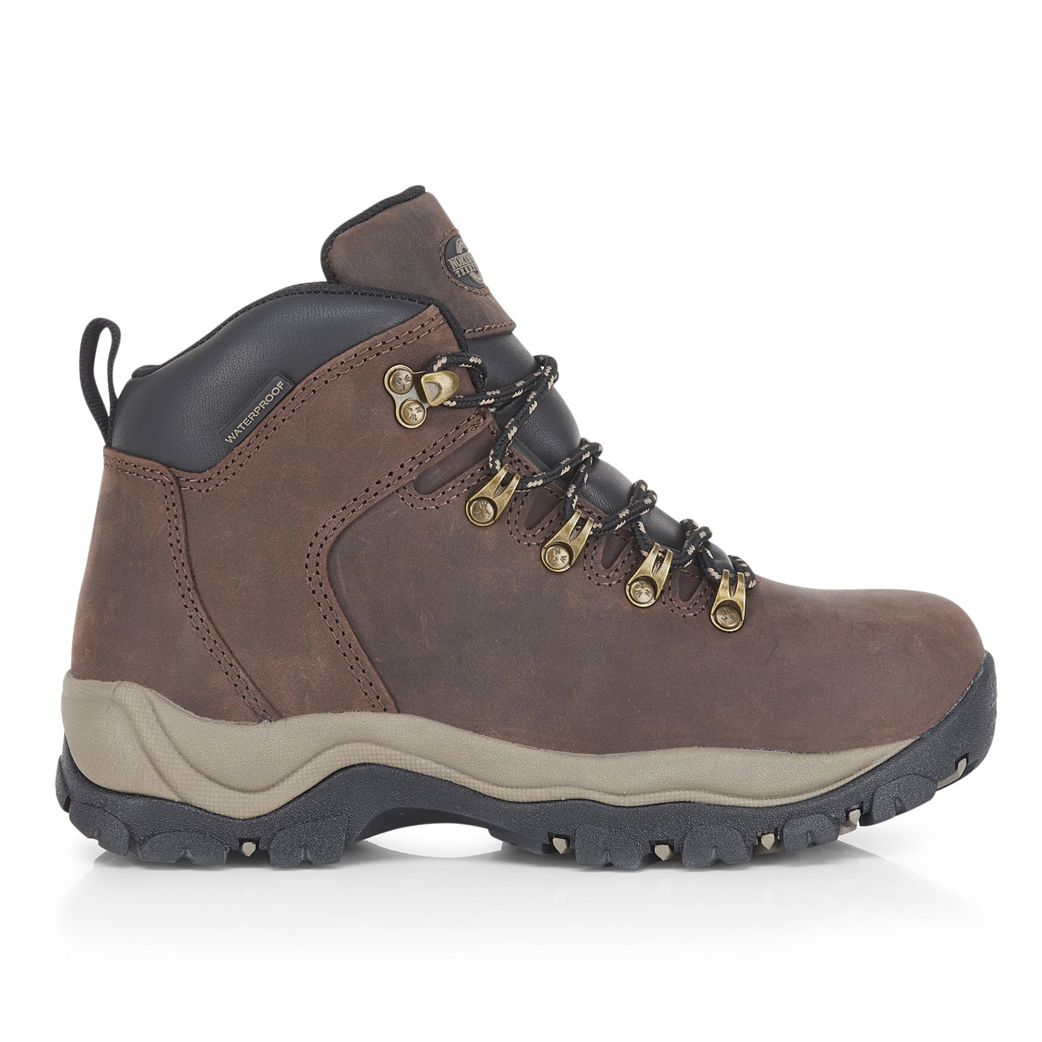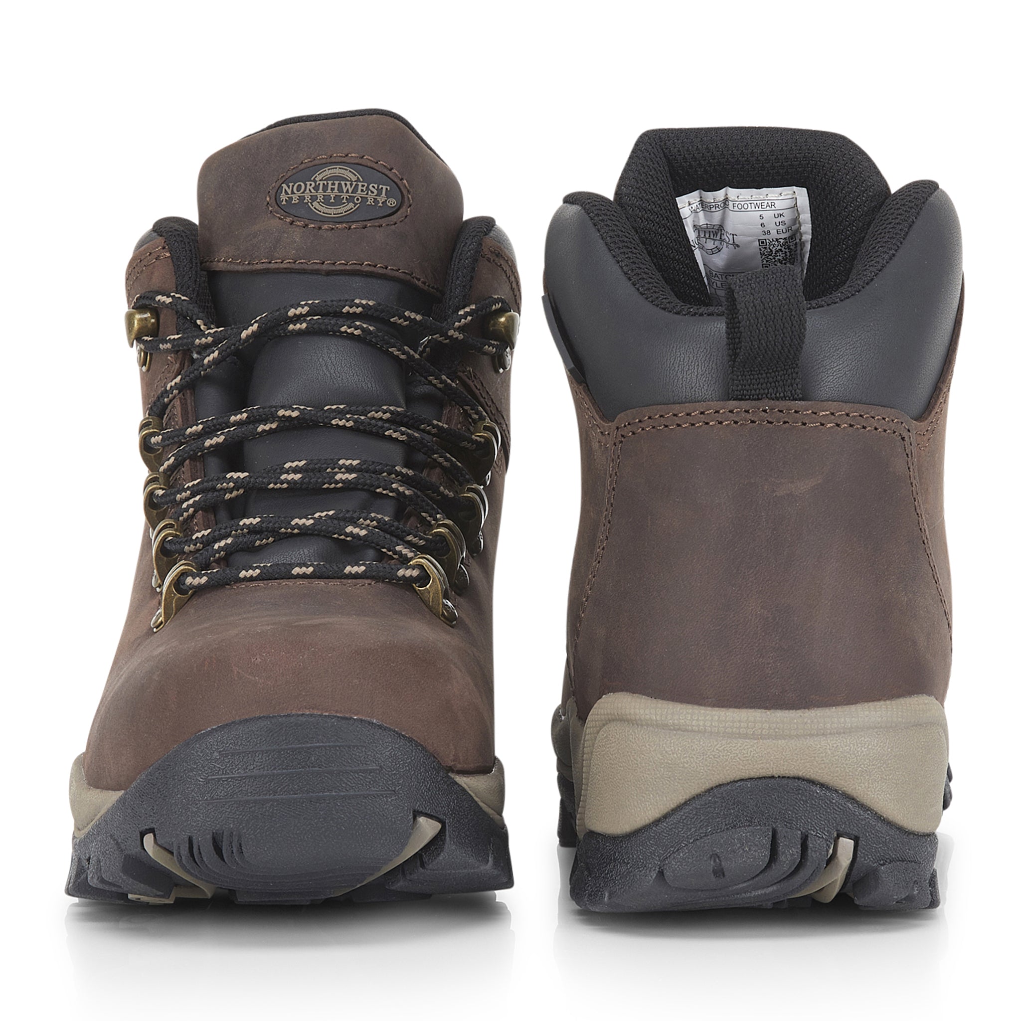 Discover the innovative Emerald Women's Leather Waterproof Walking Boots in Waxy Brown from Northwest Territory, designed to keep you comfortable in the great outdoors. Crafted from premium treated leather, these boots offer both durability and stability. Thanks to NWTDRY technology, moisture is effectively kept at bay, while maintaining the leather's softness, suppleness, and breathability. Say goodbye to stiff boots and embrace the flexible rubber outsole, ergonomically shaped for optimal support and stability. With its low tread design, these boots are perfect for both natural landscapes and urban settings.