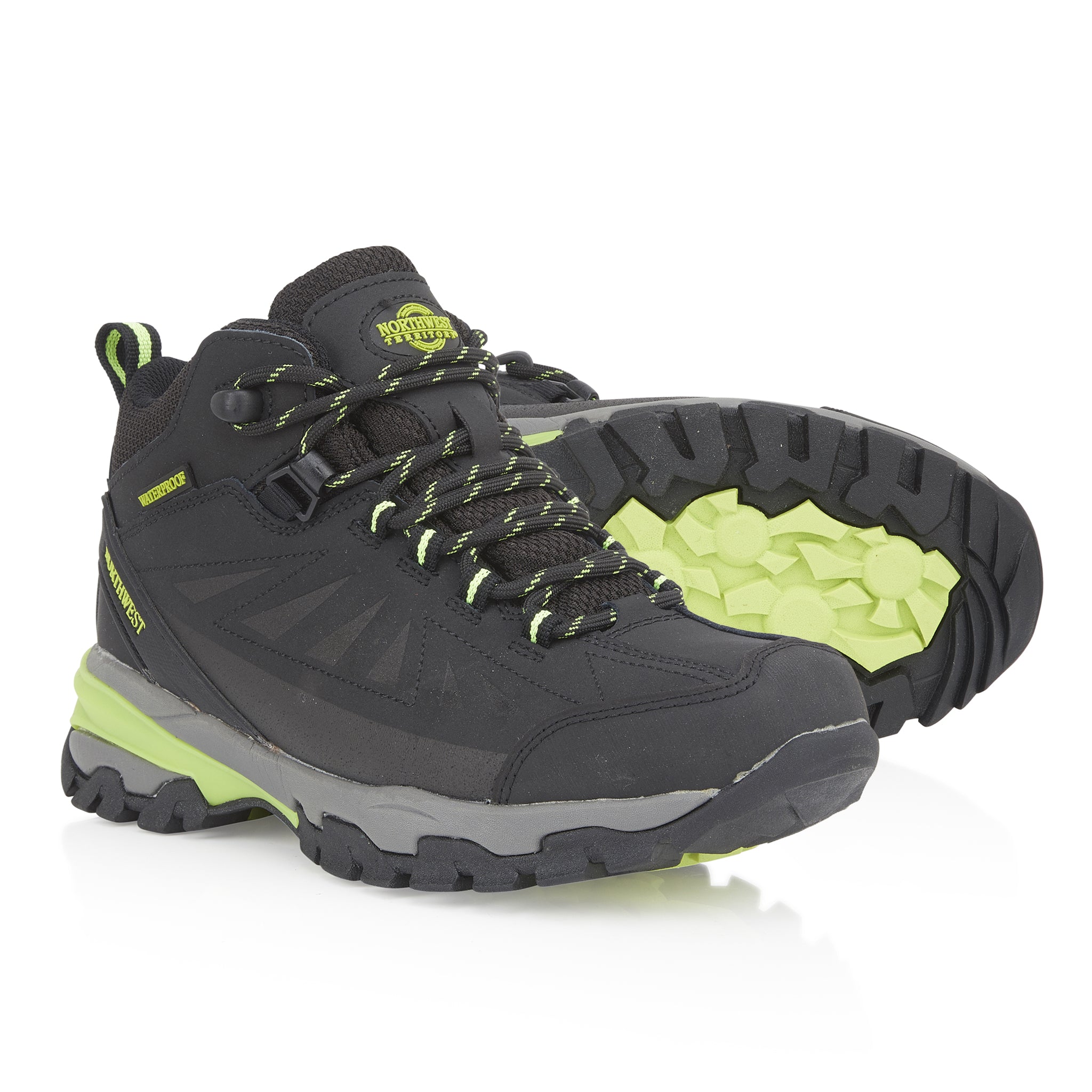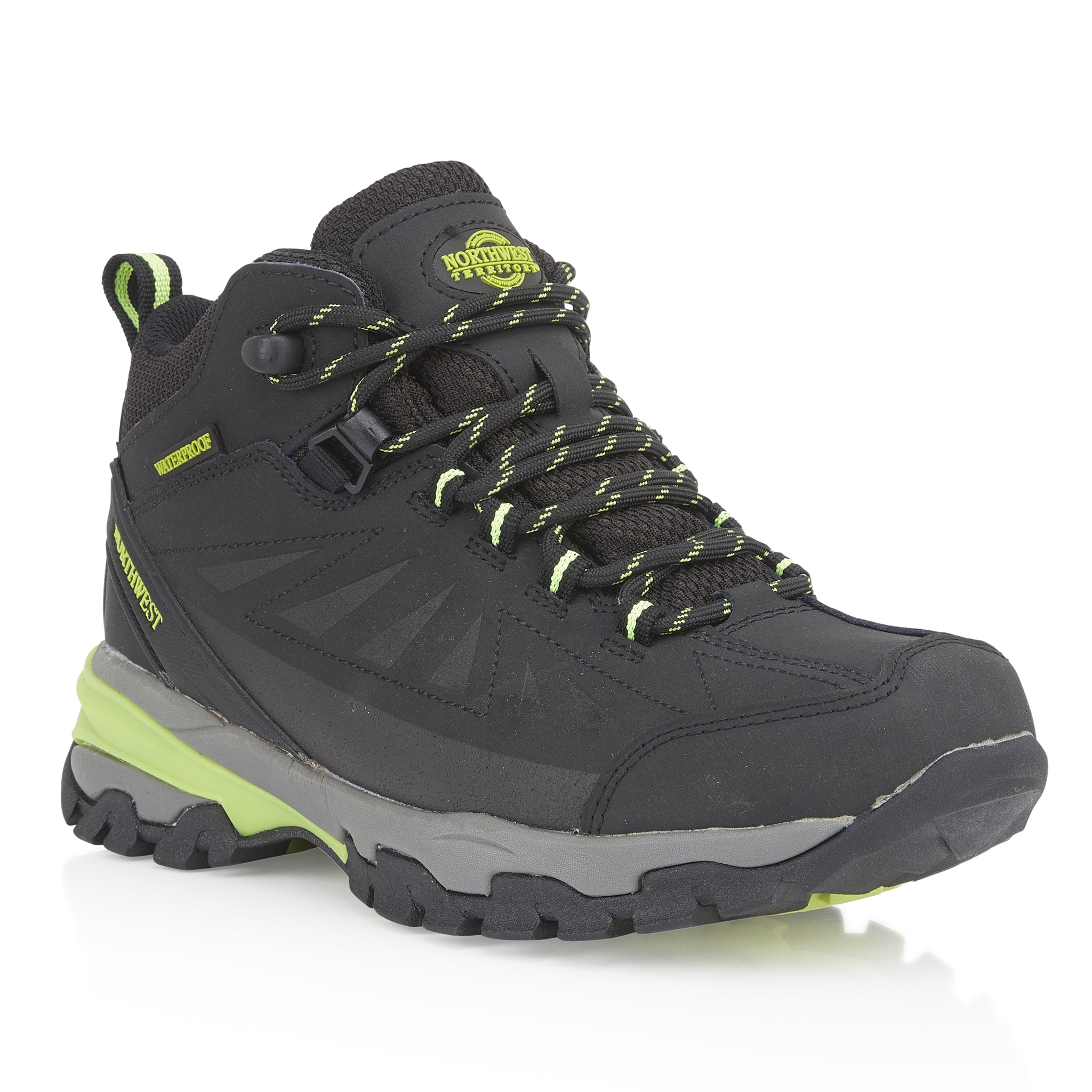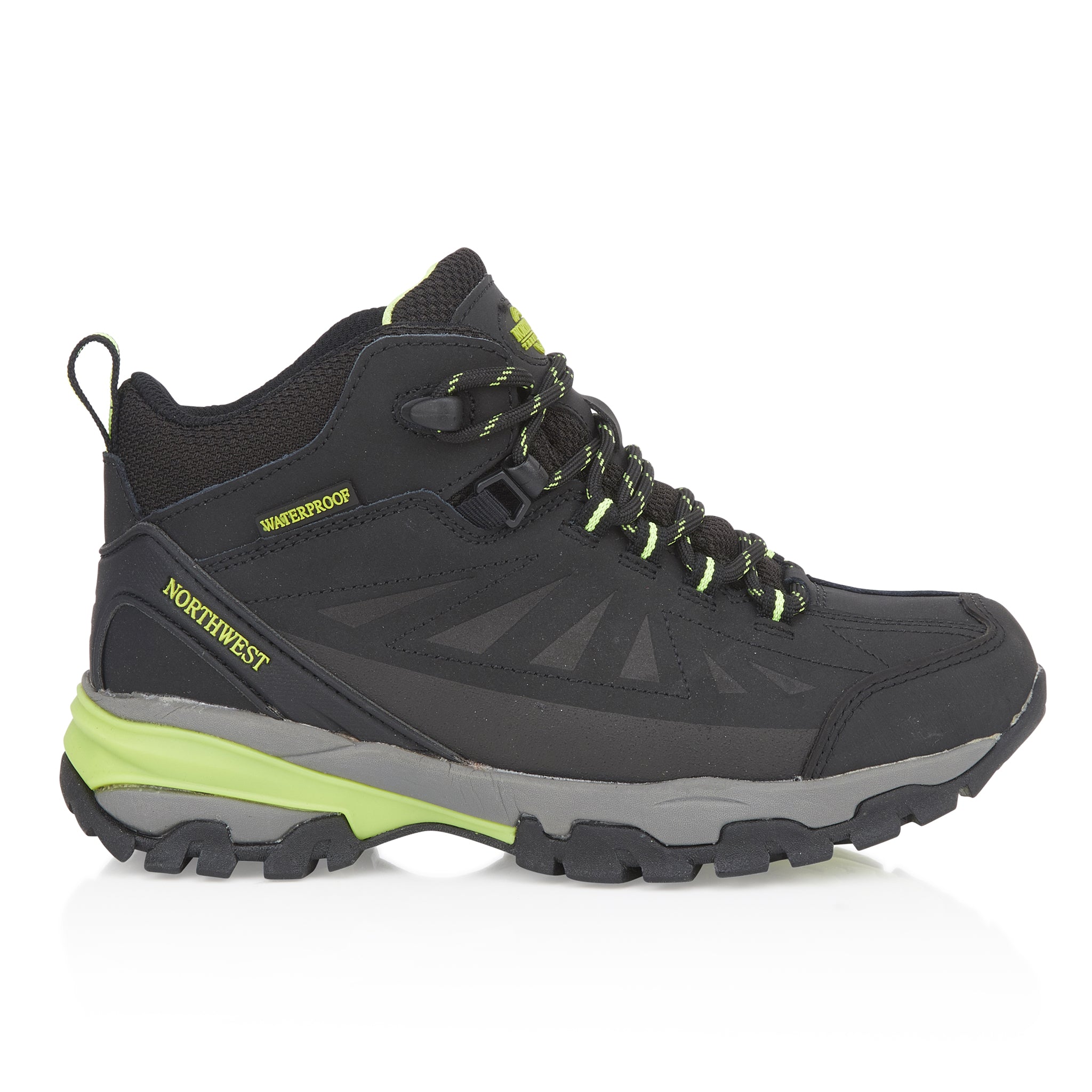 Introducing the Women's Black Lime KEELE HI Leather Mid NWTDRY boots from Northwest Territory, where classic lines, premium materials, and waterproof protection unite. These boots combine a proven bottom unit and chassis with an elegant upper to deliver a perfect balance of style and functionality. Designed for outdoor exploration, they provide stability, comfort, and durability. The soft nubuck leather upper is not only flexible but also fully waterproof, thanks to the NWTDRY lining. The seamless lining reduces the risk of hot spots and blisters, while the mid-height ankle support ensures a secure fit. The mid-cut design offers extra protection for your ankle, enhancing overall stability.