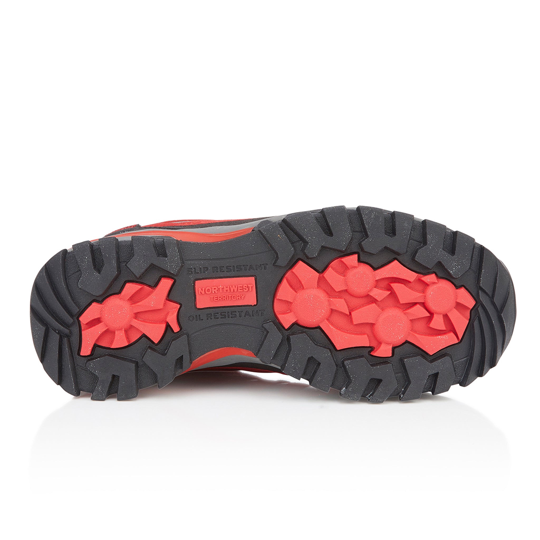 Introducing the KEELE LO Women's walking shoes in Red/Black from Northwest Territory, where classic lines, premium materials, and waterproof protection unite. These shoes combine a proven bottom unit and chassis with an elegant upper to deliver a perfect balance of style and functionality. Designed for outdoor exploration, they provide stability, comfort, and durability. The soft nubuck leather upper is not only flexible but also fully waterproof, thanks to the NWTDRY lining. The seamless lining reduces the risk of hot spots and blisters, while the ankle support ensures a secure fit.