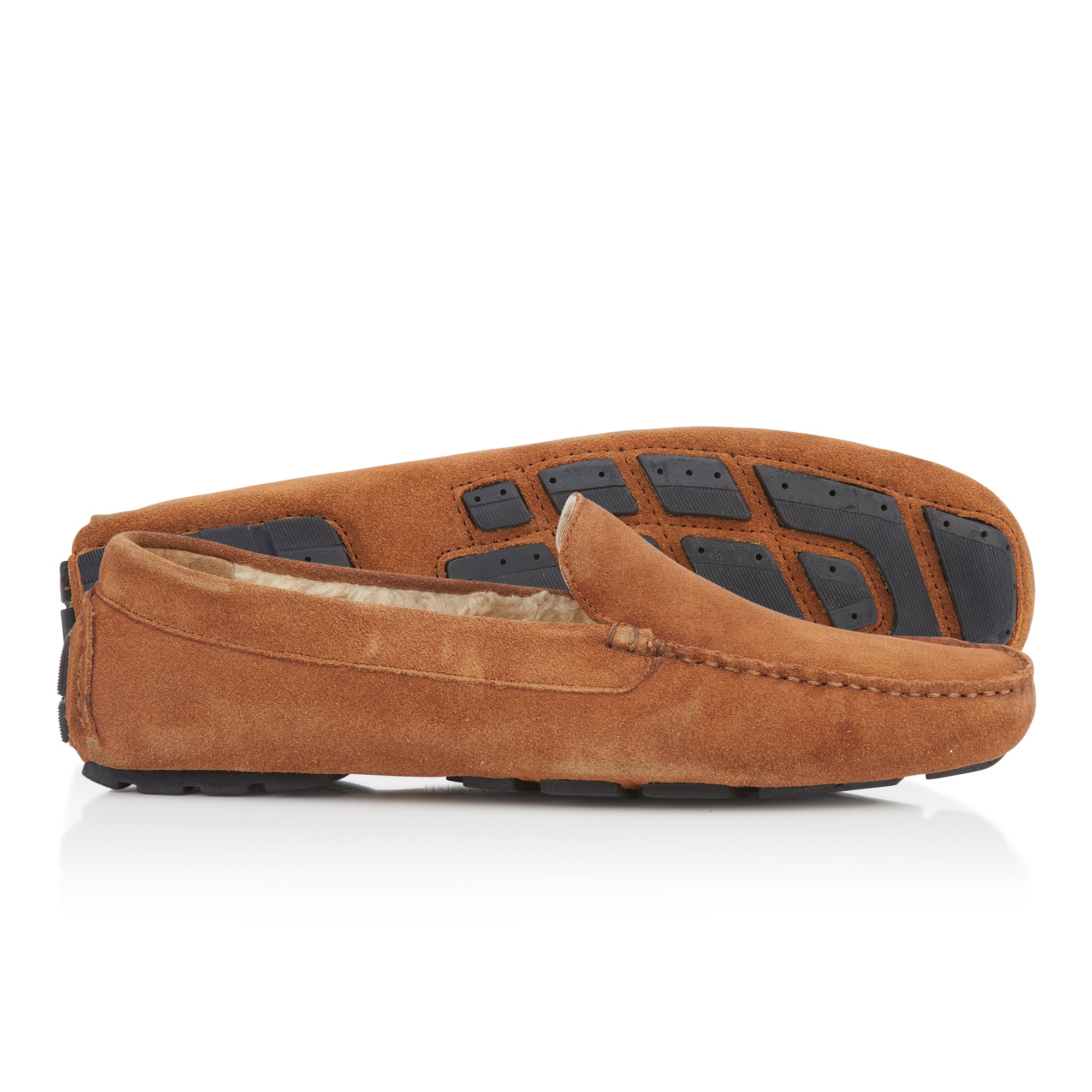 Relax in style with the LAWRENCE Men's Suede Leather Fleece Loafer Slippers in Tan.